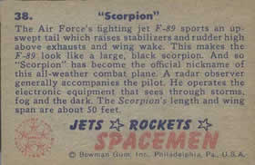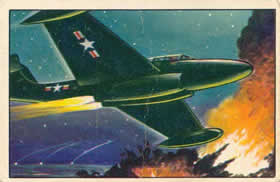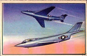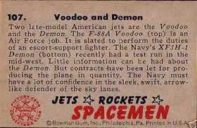 The Jets Rockets and Spacemen story unfolds in the tradition of Flash Gordon and Buck Rogers of the 1930's. Captain Zara and Doctor Zara explore the planets of outer space, fighting battles against the creatures of the solar system. The set consists of 108 cards, released in three series of 36 cards each. The cards are in a horizontal format and measure 2-1/16 x 3-1/8. The American Card Catalog number for this set is R 701-19. Six cards in the first series and three cards in the third series depict "modern" jet planes of the day. The only cards I am interested in are these nine Jets of Jets Rockets and Spacemen set. The card pictured above shows the Air Force's F-88A, Voodoo (top) and the Navy's XF3H-1, Demon.