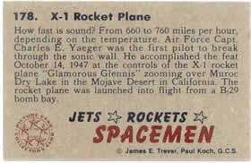 In 1980, artwork for another series of cards was discovered. 1981 saw a Jets Rockets and Spacemen extension set produced. These cards are numbered 145-180, the last series of the set, and, like the original 108 cards, are printed on gray cardboard stock. Artwork for the 4th series (numbers 109-144) has never been found. The backs of the extension set contain the notice "© James E. Trever, Paul Koch, G.C.S.".