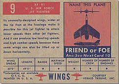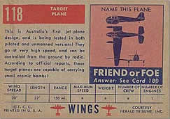 There's another piece of evidence that makes me think that this theory is true. On the card backs is the "FRIEND or FOE" quiz. The first two series of cards dealt with this in a logical fashion by having the answer to the quiz appear on the next card in sequence. For example the answer to the "FRIEND or FOE" quiz on card #9 (shows silhouette of a Cutlass) was found on card #10. The answer to the quiz on card #100, can be found on card #1. Each card stated "Ans: See Next Card XX". The 3rd and 4th series go about the quiz in an entirely different way. On the back of these two series' cards, it states: "Answer: See Card XXX". The answers to the quiz were scattered all over the place. Lots of planes are not shown in silhouette on any cards at all. Many cards have the same silhouette on their backs. However, all 3rd series cards had the answers contained within the series. The quiz answers to cards #151 and #152 were found on cards #110 and #125 respectively. The fact that they were in the box, and the fact that their quiz answers were contained on other 3rd series cards convinced me that cards #151 and #152 belong in the 3rd series. But what about cards #118 and #149? Eureka! The answers to their quizzes appear on 4th series cards #180 and #173. That makes them a part of the last series, and explains why they weren't in the box and are harder to find than other 3rd series cards.