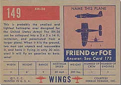 Topps Wings cards consist of 200 aircraft subjects: color paintings of planes of late 1940s and early 1950s vintage. The paintings were produced from photographs supplied by the New York Herald Tribune. The set was assigned American Card Catalog number R707-4. A silhouette-based "NAME THIS PLANE: FRIEND or FOE" quiz appears on the card backs. The cards were sold in both 1¢ and 5¢ wax packs, as well as 5¢ cello packs. The cards measure 2 5/8" x 3 3/4". The complete set of 200 Wings cards were reissued with larger side borders by Doeskin Tissues in the fall of 1955. They have "Doeskin" printed on the back in the copyright area. The Doeskin Wings set was assigned the ACC number F381. The Doeskin Wings cards measure 2 5/8" x 4 3/8". Complete packages of these tissues, including the card, are sometimes offered on eBay.