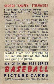 My first order of business was to find out what was written on the backs of all 324 cards. I probably had 300 different cards by this point; the cards I didn’t have were all high numbers, including the Mantle and Mays cards, which to this day I do not have (This was before the 1951 Bowman reprint set or the internet). I corresponded with dealers and had them copy down exactly what it said on the backs of cards and mail the information to me; I copied card backs at shows I attended. I then began to place the cards into different categories based on the kind of information they contained. I separated players, who had been traded during the 1951 season, and it was noted on the card, from players who had been traded and no mention of the trade was made. Likewise, those who were sent to the minors during 1951 - mentioned and not mentioned. I spent months looking at microfilm of the sports pages of the “New York Times”, in my local library, and noted all the 1951 player and manager movement I could find.