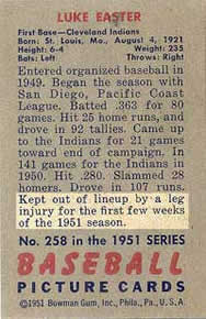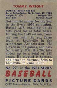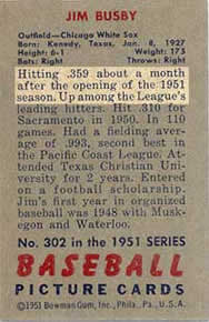 I have almost 200 pages of research on the 1951 Bowman baseball card set and the 1951 baseball season: lists, team field diagrams, rosters, letters, pictures, autographs, etc. I have a searchable database containing all 554 [2] players in the majors during 1951, with most of their important batting, pitching, and fielding statistics. I developed a set of templates for all 324 1951 Bowman cards, containing summaries of the information I found by reading the card backs, as well as player career highlights and lowlights. I have team lists showing which players appeared in the 1950, ‘51, and ‘52 Bowman sets and the 1952 Topps set. I would be extremely interested in corresponding with any readers who share my fascination with the 1951 Bowman baseball card set, and its players. If any reader actually knows the true printing dates for any, or all series of 1951 Bowmans, please send me an e-mail to the Webmaster, below.Clint Cramer's fine 1951 Bowman Web site can be accessed from this link.