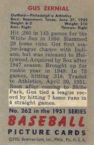 [1] 1952 Topps card number 31 commemorates the same event one game earlier. Gus hit 6 homers in three straight games - thus the six balls attached to his bat.