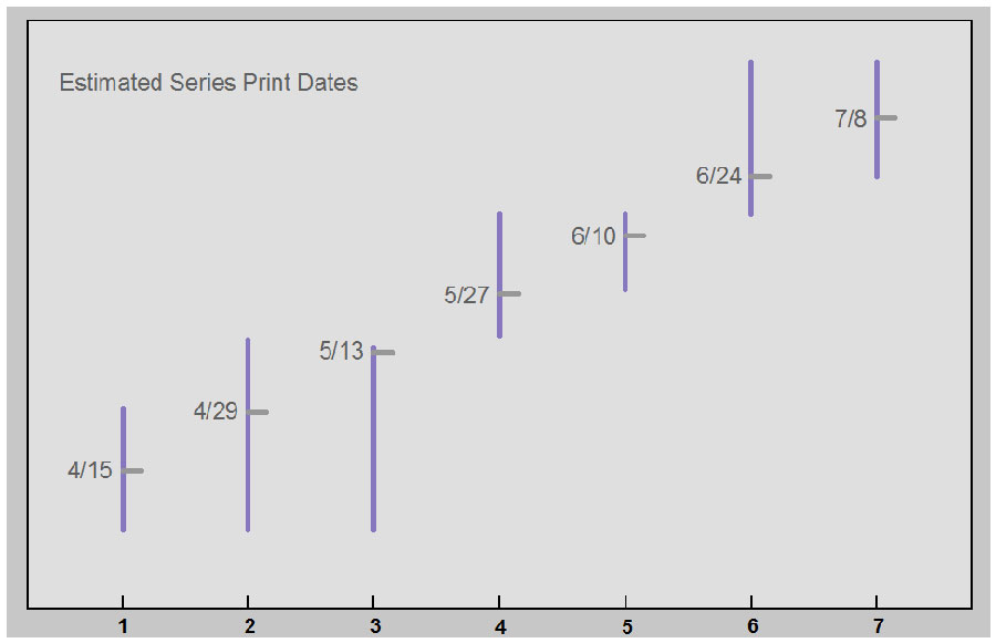 The vertical bars represent the time span when a series could have been printed. The bottom of the series 1 bar is April 1, 1951, and the top of the series 7 bar is July 21, 1951. The black squares represent my guess as to when each series was actually printed. Estimated print dates for each series are: