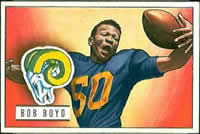 1951 Bowman football cards, both front and back, bear a striking resemblance to the baseball cards of that year. The major difference is the inclusion of a team logo on the card fronts. Bowman's third football set contained 144 cards, in the now familiar 2 1/16" x 3 1/8" size. Notable rookies in the set include, Norm Van Brocklin, Tom Landry, Arnie Weinmeister, Bill Walsh, Emlen Tunnell, and Ernie Stautner. Although I do not currently collect this set as a whole, there's something about the Rams logos that really sets off the player's image. Bowman used the same logo treatment for their 1952 football set, as well.