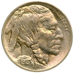 James Earle Fraser, a former assistant to Saint-Gaudens and a prolific artist best known for his monumental "End of the Trail" Indian sculpture, created a truly unique design for the new coin. Up until that time, except for Bela Lyon Pratt's quarter and half eagle of 1908, the "Indians" portrayed on U.S. coins were primarily Caucasian with an Indian headdress, epitomized by Saint Gauden's Greek Nike head on the 1907 Indian eagle. Fraser's design accurately portrays Indians as they look, and the obverse portrait was a composite of three chiefs that had posed for him. Keeping with the distinctly American theme, he depicted an American bison on the reverse. The inscriptions UNITED STATES OF AMERICA and E PLURIBUS UNUM are artfully placed over the buffalo, with the denomination FIVE CENTS below. The legend LIBERTY and the date are similarly well executed on the coin's obverse.