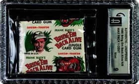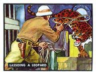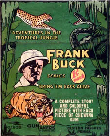 In 1950, the creative minds at Topps decided that they could sell even more bubble gum by inserting trading cards. The first trading cards were Hopalong Cassidy, the TV and film cowboy; and "Bring 'em Back Alive" cards, featuring Frank Buck, the master trapper, in Africa. I think these were the first cards I ever collected as a kid. What 10-year-old could resist pictures of a python swallowing a baby pig, a tiger attacking an elephant, a leopard and a crocodile wrestling, canibals, blow guns, etc. This Topps set may have been patterned after the successful Gum, Inc. issue of 1938 (R55). The cards measure 2 1/16" x 2 5/16". They came attached, in panels of 2, much like the Topps 1951 baseball card offering. Follow this link to images of the complete set (courtesy of the Network54 Forum).