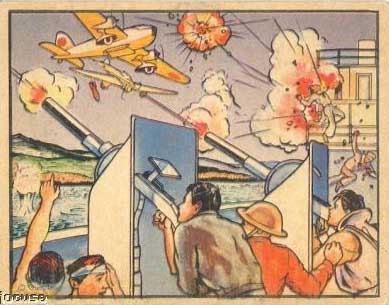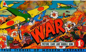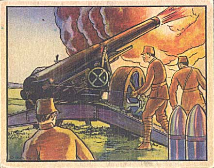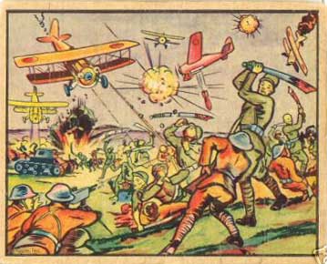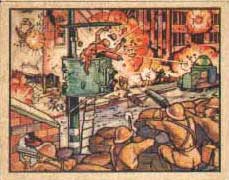 The Horrors of War set is quite probably the most famous non-sport card set ever issued. It was issued by Gum Inc., the predecessor of the Bowman Gum Company, starting in 1938. The illustrations are colorful, detailed and gruesome. Conceived as a 240-card set about the Chinese-Japanese War, the Ethiopian War and the Spanish Civil War, the set proved so popular that an additional 48 cards were added about Germany and the beginning of World War II. The addition of these 48 cards to the set did not prove as successful as Gum, Inc. anticipated and hence the last 24 cards and in particular the last 12 cards have proved very elusive to collectors. Any card picturing Hitler is especially desirable. The card on the left is #2, "Chinese Big Sword Corps Resists Jap Forces". The complete set can be seen (on the Network54 Forum, by clicking here. The American Card Catalog designation is R69.